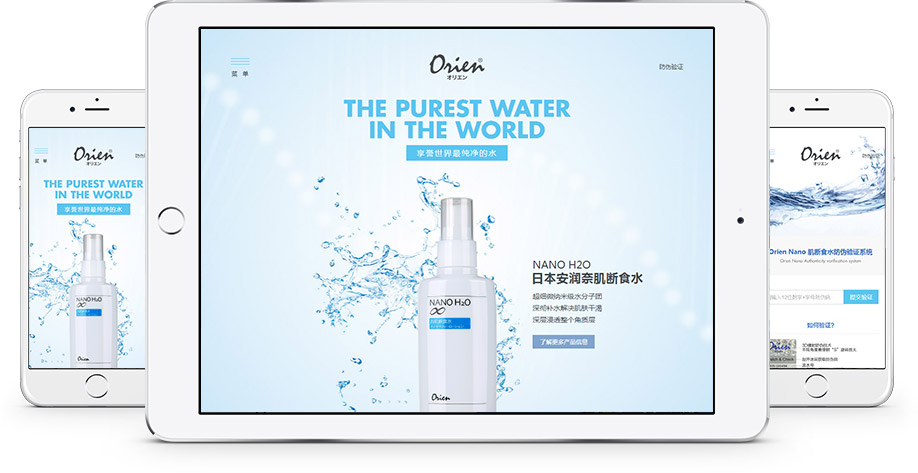Orien nano肌断食水是日本品牌,由采妍国际引进中国市场。肌断食水是一款特别纯粹干净的化妆水,只含单一的H₂O,使用美国SANA(美国航空总署)开发的纳米制水机器制造,净化后的水分子团体积极小仅有0.1纳米(0.0001微米),能穿过美国SANA的反渗透膜,纯净度可达99.999%。所以肌断食水需要一个全新的网站,体现出纯净、清爽的感觉,同时又可以让PC、iPad、iPhone都完美访问的功能。